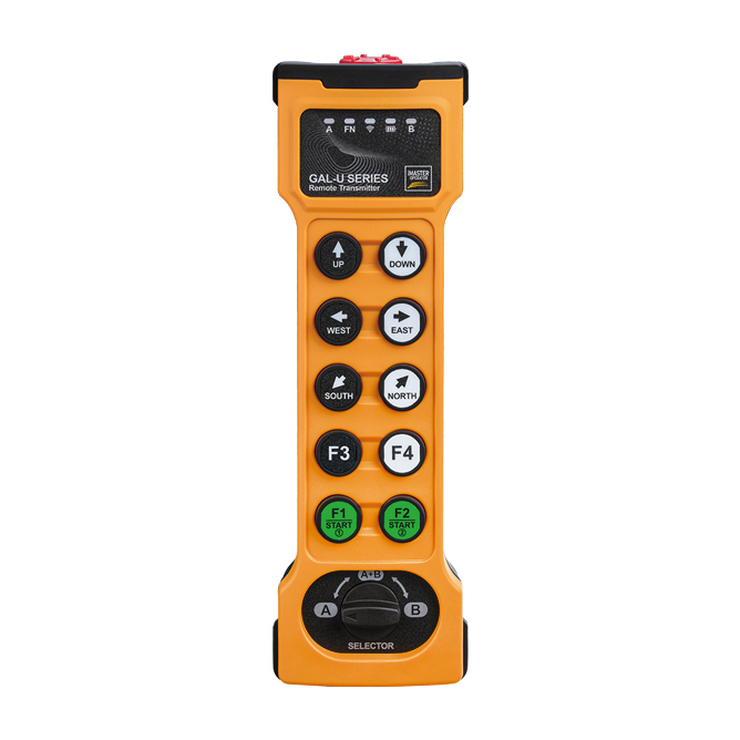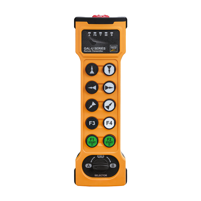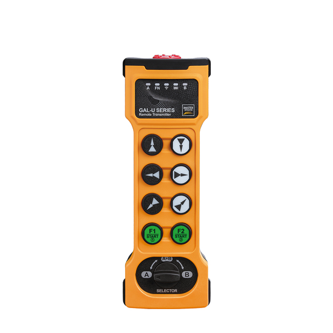 This handheld transmitter is divided into 8-key and 10-key two speed modes to control the corresponding control points. It is equipped with a unique design of a 90 degree directional selection switch, which facilitates the switching and linkage function of the main and auxiliary equipment. It has a mechanical directional selection function.